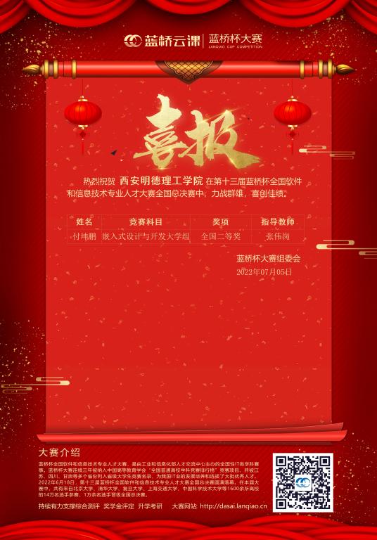 近日,第十三届“蓝桥杯”全国软件和信息技术专业人才大赛(电子类)国赛结果揭晓,世界杯官网信息工程学院参赛学生付坤鹏同学荣获全国二等奖,其在张伟岗老师的带领下所完成的竞赛项目为“嵌入式设计与开发大学组”。