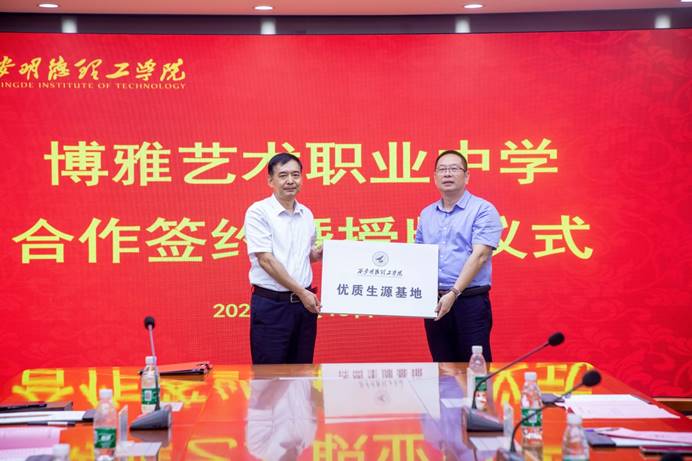 仪式最后,校长杨健君代表世界杯官网与博雅艺术职业中学签署“合作协议书”,为同时为博雅艺术职业中学授予了“优质生源基地”、“明德博雅艺术类教育教学基地”、“就业实习基地”牌匾。