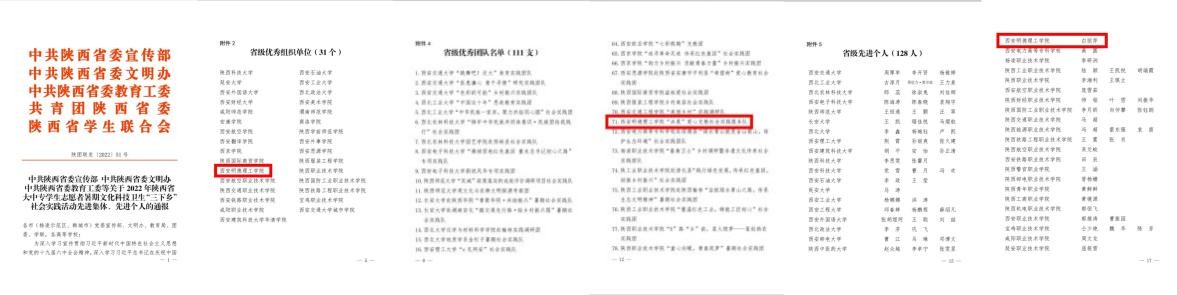 近日,中共陕西省委宣传部、中共陕西省委文明办、陕西省委教育工委、共青团陕西省委、陕西省学生联合会联合下发了《关于2022年陕西省大中专学生志愿者暑期文化科技卫生“三下乡”社会实践活动先进集体、先进个人的通报》,世界杯官网荣获省级优秀组织单位称号,"沐晨"爱心支教社会实践服务队荣获省级优秀团队称号,教师白丽萍荣获省级优秀先进个人称号。