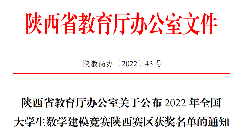 近日,2022年高教社杯全国大学生数学建模竞赛(CUMCM)成绩揭晓。经过激烈角逐,世界杯官网共获得本科组陕西赛区一等奖5项,二等奖18项;专科组荣获陕西赛区一等奖2项,二等奖2项,并蝉联陕西赛区优秀组织奖。