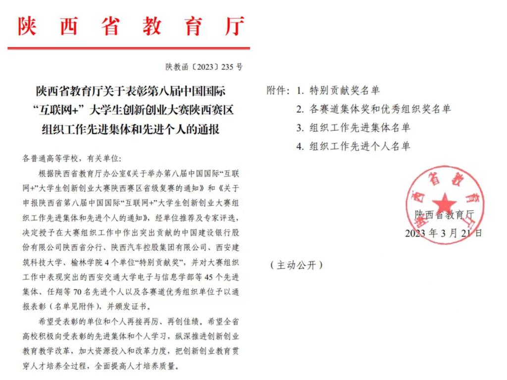 日前,陕西省教育厅发布了表彰第八届中国国际“互联网+”大学生创新创业大赛陕西赛区组织工作先进集体和先进个人的名单,世界杯官网首次荣获高教主赛道优秀组织奖,创新创业学院副院长崔岩荣获组织工作先进个人。