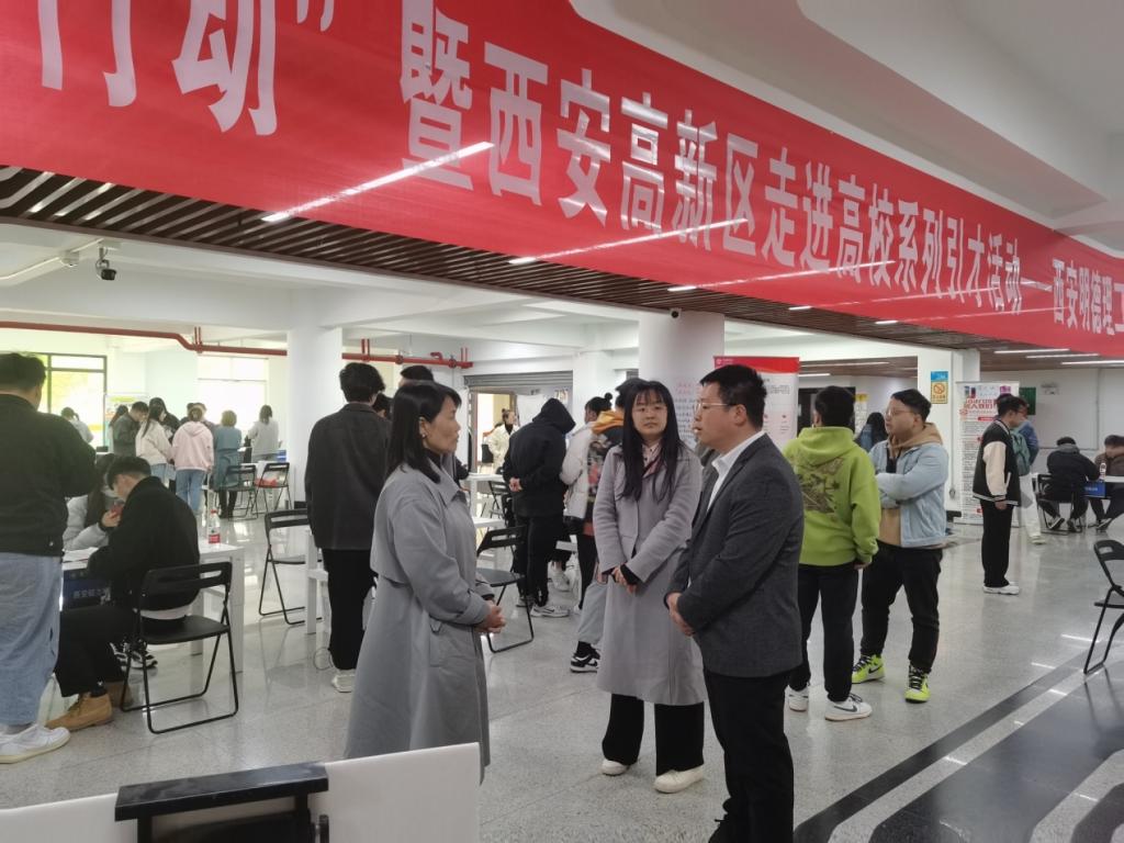 为深入学习贯彻党的二十大精神,践行就业优先战略部署,通过搭建平台,实现用人单位和毕业生双向奔赴,4月4日上午,2023年陕西省高校毕业生促就业“启航行动”暨西安高新区走进高校系列引才活动走进世界杯官网,在学校图书馆一楼举办专场招聘会。西安市高新区人才办主任范鑫、高新区组织人事部王子怡莅临招聘会现场进行指导,学校招生就业中心副主任王东辉陪同交流。