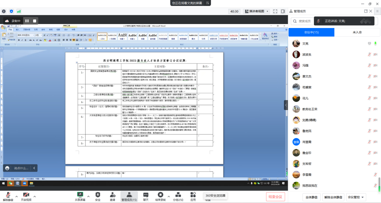 为进一步做好2023版本科专业人才培养方案的修订工作,4月26日,学校组织召开了教学工作指导委员会专题会议,教学工作指导委员会主任王志刚常务副校长、副主任支希哲教授,以及学校教学工作指导委员会委员参加了专题会,教务处处长朱延波主持会议。