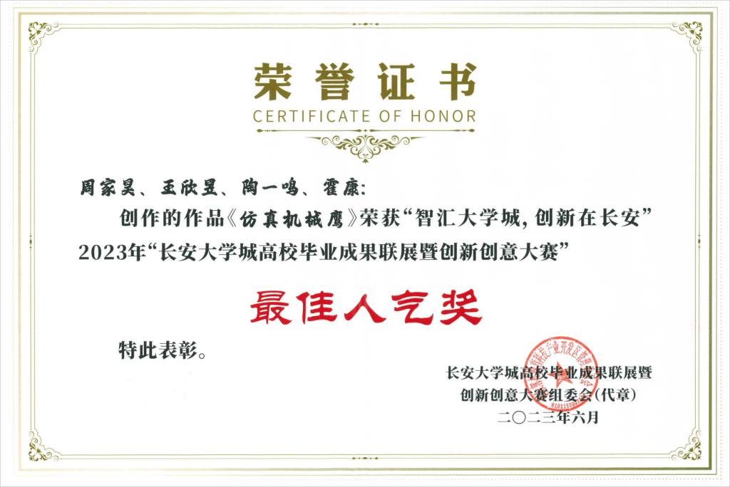 5月29日-6月5日,长安区举办了由长安区委、区政府及驻区各高校主办,区委组织部(区委人才办)、郭杜开发区承办的长安大学城高校毕业成果联展暨创新创意大赛。大赛旨在为毕业成果交易和人才推介搭建平台,助力高校师生创意落地、科技成果转化,推进长安区人才队伍建设和科技创新工作,让广大学生爱上长安、留在长安、创业长安、贡献长安。世界杯官网王泽老师指导的《仿真机械鹰》作品喜获“最佳人气奖”。