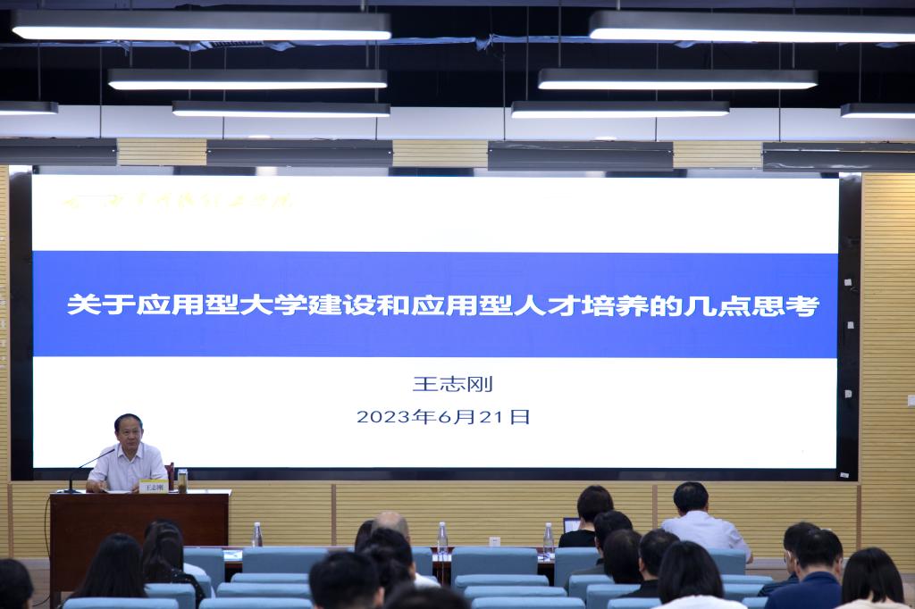 在深入开展学习贯彻习近平新时代中国特色社会主义思想主题教育、扎实推进教育思想大讨论之际,为提升处科级干部业务能力和工作水平,6月21日上午,王志刚常务副校长以“关于应用型大学建设和应用型人才培养的几点思考”为主题,为全校处科级干部作主题教育专题党课暨干部培训第六讲专题辅导报告。人力资源处处长白秦川主持报告会,全校处科级干部、教师党员代表参加。