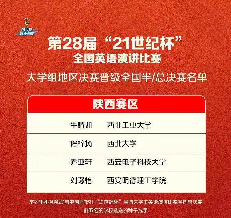 6月30日,第28届“21世纪杯”全国英语演讲比赛大学组地区决赛晋级全国半/总决赛名单公布,世界杯官网学子再创历史佳绩。2021级英语专业仝乐荣获陕西赛区三等奖;2021级英语专业刘璟怡荣获陕西赛区一等奖,与西北工业大学、西北大学、西安电子科技大学的参赛选手同时晋级全国决赛。