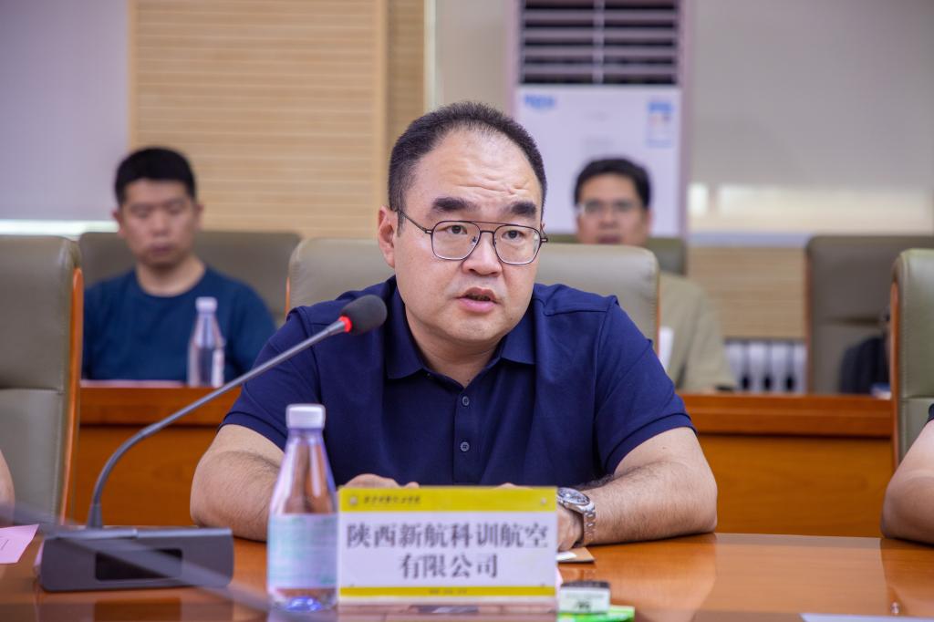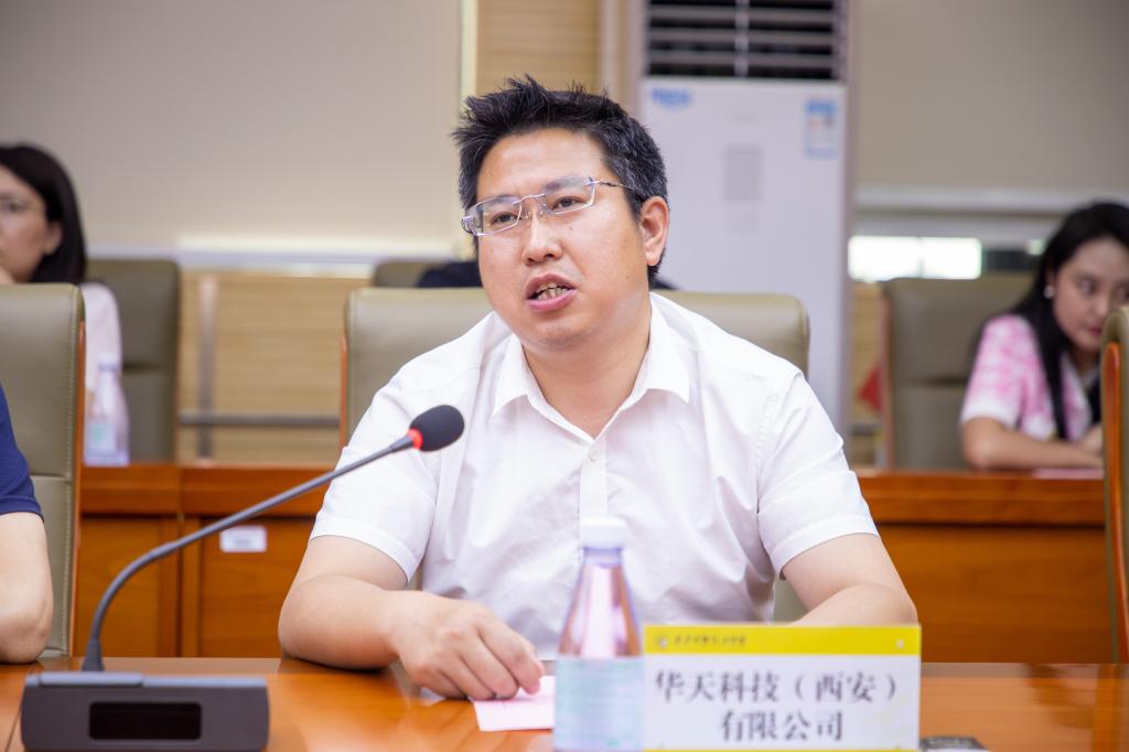 随后,陕西新航科训航空有限公司董事长吴光焱、陕西易通人力资源股份有限公司总经理刘晓平、华天科技(西安)股份有限公司人力资源部部长李大树作为企业代表进行发言。各位企业代表向此次集体签约暨授牌仪式的举办表示热烈祝贺,同时也希望在今后的合作中,进一步探索信息、人才、技术与资源共享机制,以促进校企双方达成更加深入,更具有实效性的高质量合作。