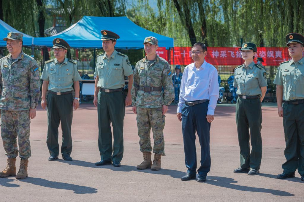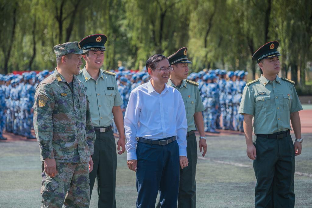 8月30日上午,空军某部政治委员程强、校长杨健君、党委副书记董昊来到2023级学生军训训练场地看望参加军训的同学们和负责本次军训任务的教官和指导员。