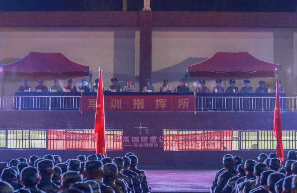 军训教官与参训学员整装肃立,精神抖擞,齐声向领导敬礼问好。