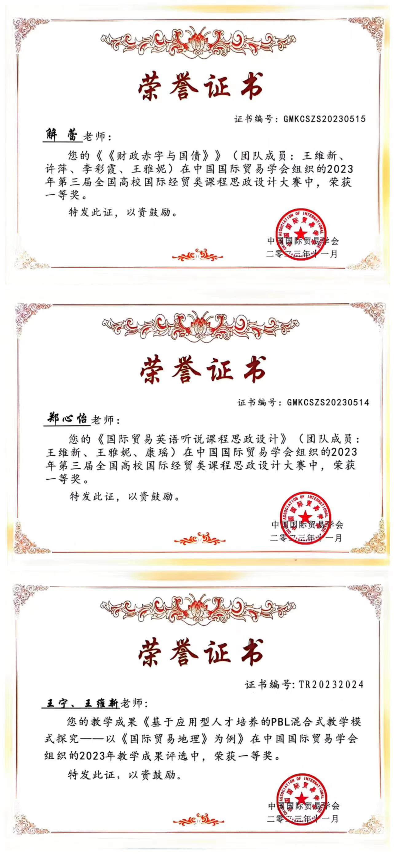 由中国国际贸易学会、全国外贸单证岗位技能大赛组委会主办的第三届“慧华”杯全国高校国际经贸类课程思政设计大赛于2023年12月圆满结束。经济与管理学院5位参赛教师报送《课程服务岗位业务服务规范》、《财政赤字与国债》等5门课程,最终取得了国家一等奖2项、二等奖2项、三等奖1项的优异成绩,为教师组学科竞赛再添新荣誉。