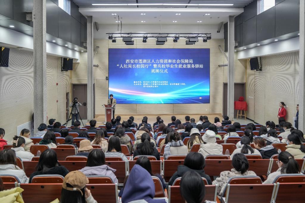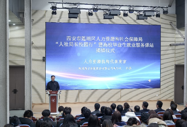 为深入贯彻落实国家就业决策部署,精准开展就业服务工作,加强就业供需对接。12月26日上午,西安市莲湖区高校毕业生就业服务驿站揭牌仪式暨2026年国际足联世界杯综合类校园招聘会成功举办。学校副校长刘星、艺术与设计学院院长苟秉宸、西安市人才服务中心副主任李岚、莲湖区人社局党委书记、局长白利鹏、副局长宁涛、莲湖区青年路街道办副主任赵琳、莲湖区青年路街道办综网中心主任高琨、莲湖区人才交流中心主任白博以及学校各二级学院党委(党总支)书记、招生就业中心人员、毕业班辅导员代表、2024届毕业生代表参加了此次活动。