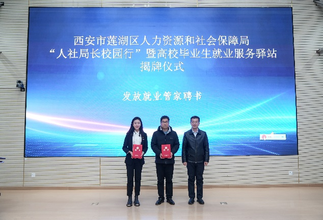 莲湖区人力资源和社会保障局党委书记、局长白利鹏介绍了莲湖区高校毕业生就业服务驿站服务概况;副校长刘星和西安市人才服务中心副主任李岚为莲湖校区就业服务驿站揭牌;莲湖区人社局副局长宁涛为学校艺术与设计学院党委书记雷宇、招生就业中心就业办公室主任王育春两名同志颁发学校毕业生“就业管家”聘书;陕西新才控股股份有限公司董事长孙鹏就如何依托高校就业驿站开展就业服务工作做了发言;莲湖区人社局张雪莲详细介绍了就业见习和就业创业等相关政策,现场对见习人员范围,补贴标准,申报材料及渠道等相关政策进行了一一解答,在场同学积极参与互动,氛围热烈。企业代表西安丰禾万达人事行政高级经理王宛佼通过生动的案例、详实的数据为同学们分析当前就业形势,指导如何择己所需,择己所长,择己所爱,择己所利,帮助同学们了解求职技巧并做好充分的就业准备,打通用人单位与高校毕业生的沟通桥梁,助力世界杯官网毕业生就业。