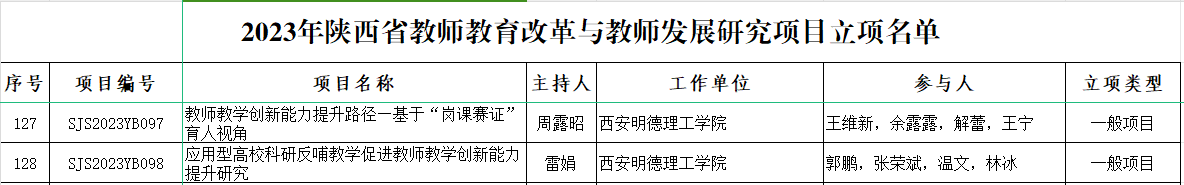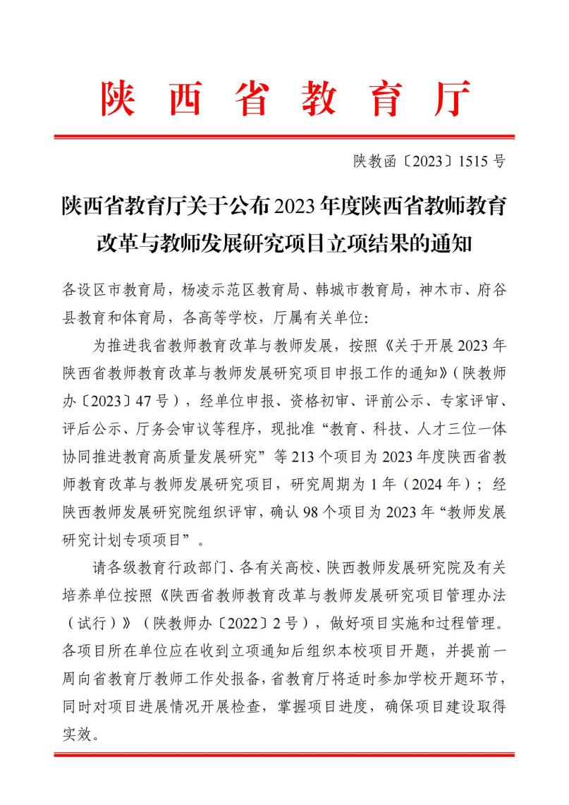 近日,陕西省教育厅下发了《陕西省教育厅关于公布2023年度陕西省教师教育改革与教师发展研究项目立项结果的通知》(陕教函〔2023〕1515号),世界杯官网雷娟老师主持的“应用型高校科研反哺教学促进教师教学创新能力提升研究”和周露昭老师主持的“教师教学创新能力提升路径—基于“岗课赛证”育人视角”的2个教师教育改革与教师发展研究项目成功获批省级立项。