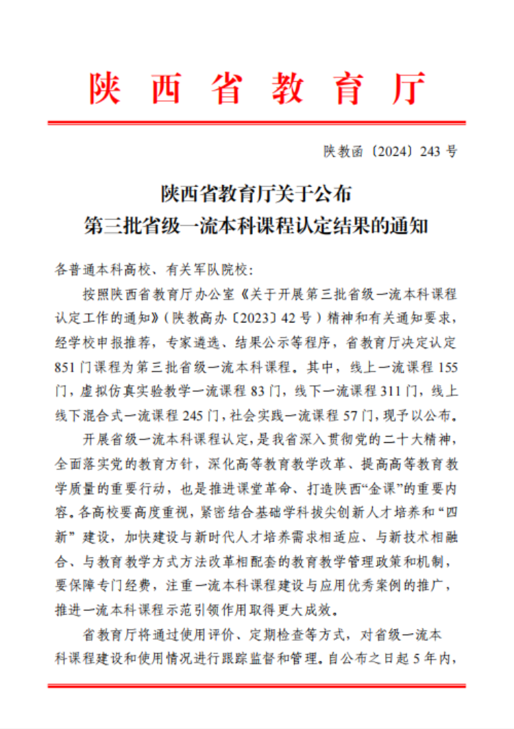 近日,陕西省教育厅公布了第三批一流本科课程认定结果,世界杯官网5门课程被认定为省级一流本科课程。至此,世界杯官网共获批省级一流本科课程18门,包含线下课程11门、线上线下混合课程4门、虚拟仿真实验教学课程1门、社会实践课程2门,其中《物联网导论》《基于物联网的智慧农业虚拟仿真实验》两门课程被陕西省教育厅推荐申报第三批国家级一流本科课程。