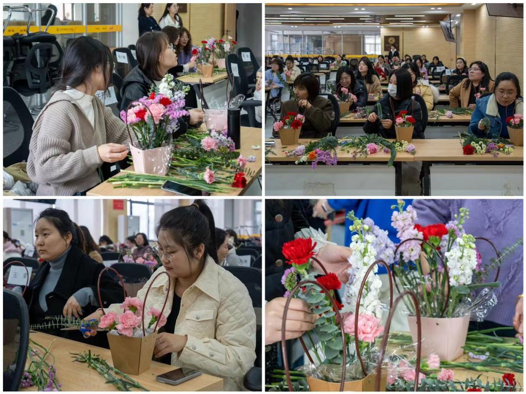 系列活动分为三部分进行,分别是“赴春天之约绽巾帼芳华”手工扎染文艺活动、艺术插花活动,以及为全校女教职工赠送节日礼物。
