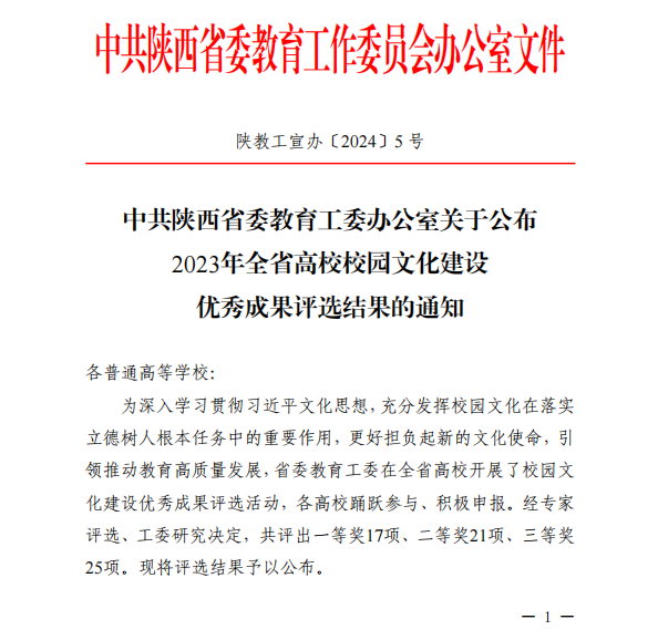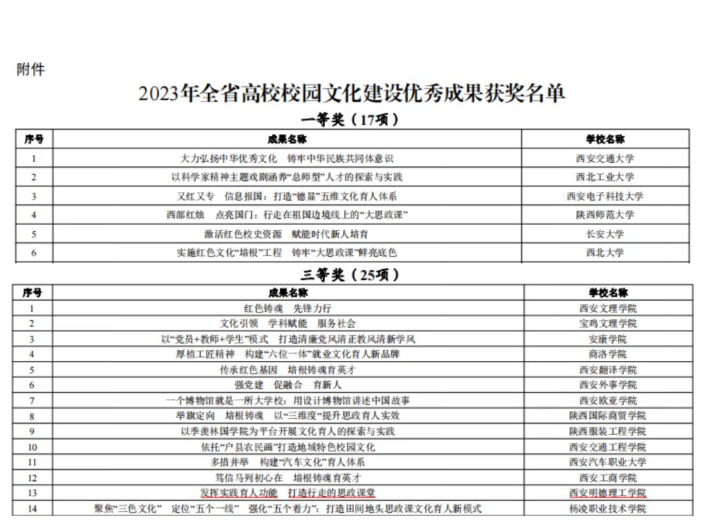 近日,陕西省委教育工委公布2023年全省高校校园文化建设优秀成果评选结果,学校申报的《发挥实践育人功能,打造行走的思政课堂》荣获三等奖。这是学校继2021年、2022年后,再次荣获全省高校校园文化建设优秀成果奖。