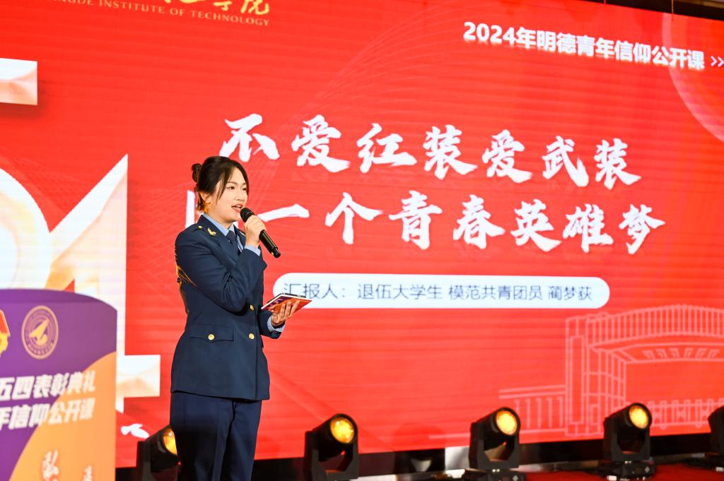 退伍大学生、模范共青团员、语言文化传播学院学生蔺梦荻作《不爱红装爱武装,圆一个青春英雄梦》主题分享。