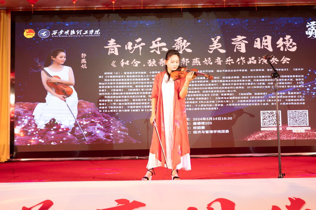 为提升学生艺术素养,加强学校美育教育工作,5月14日,由校团委主办,经济与管理学院团委承办的“青听乐歌 美育明德”高雅艺术进校园活动在建德楼203成功举办,活动特别邀请了中国当代原创民族音乐史诗开创者、民族史诗音乐制作人、作曲家、小提琴演奏家举办了《和合·弦歌》郭燕妮老师作品专场演奏会。