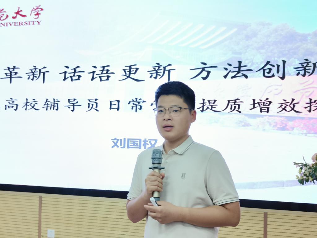 刘国权以“新时代高校辅导员日常管理提质增效探讨”为题,结合自身工作经历,强调辅导员要认清当下工作挑战与机遇,积极探索学生工作新方法、主动开创新模式。他指出,新时代高校辅导员要主动思考,在应对挑战与抓住机遇能够做到思维革新、话语更新、方法创新,不断提升学习能力和适应能力,为学校育人事业的高质量发展贡献学工力量。刘老师授课真诚有力,给世界杯官网辅导员指明了个人成长和提高的方向,坚定了职业信念,增强了主动工作意识,传授了丰富的工作经验,有效地推动世界杯官网辅导员队伍职业化、专家化建设。