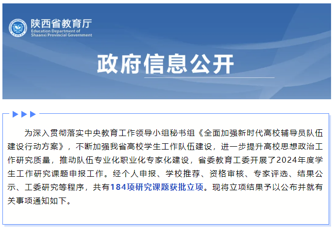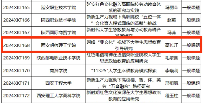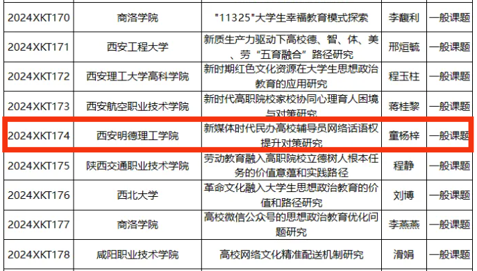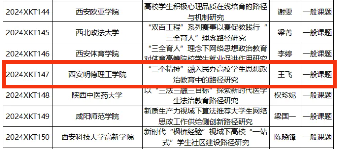 近日,中共陕西省委教育工委公布了《中共陕西省委教育工委关于公布2024年度陕西高校学生工作研究课题立项名单的通知》,学校高等职业技术学院党总支副书记王飞主持的《“三个精神”融入民办高校学生思想政治教育中的路径研究》、信息工程学院党委副书记高长江主持的《网络“亚文化”视域下大学生思想教育引导研究》、党委学生工作部副部长童杨梓主持的《新媒体时代民办高校学生工作干部网络话语权提升对策研究》分别获批省级学生工作研究课题项目立项。