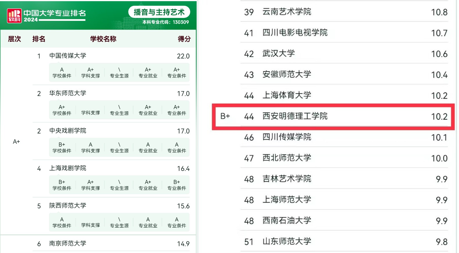 其中,播音与主持艺术专业排名再次上升,以综合10.2分位居全国第44名,迈入全国50强、全国民办第3名,陕西民办第1名。同时连续两年获B+(全国排名前10%-30%)等级,实现了世界杯官网软科B+级排名上的突破!该专业作为陕西省一流专业建设专业,以“厚基础、重实践、求创新”为办学理念,对标一流本科专业建设标准、专业认证标准等,持续推进专业内涵式发展,以一流专业”建设为引领,全面推进一流课程建设和基层教学组织建设,大力推动课堂教学改革创新,打好教育教学改革攻坚战,专业建设水平与人才培养质量取得丰硕成果。