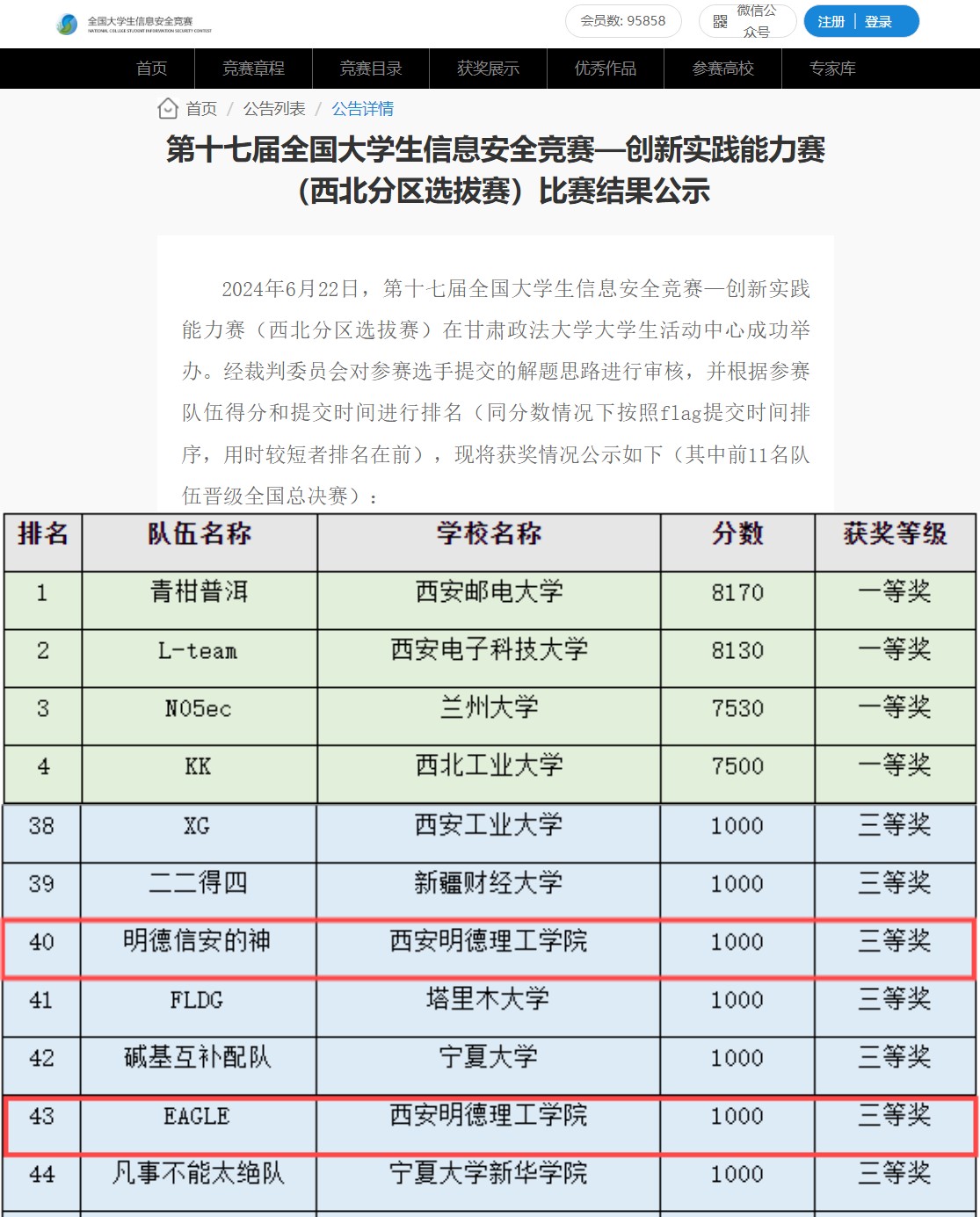 2024年6月22日,第十七届全国大学生信息安全竞赛创新实践能力赛(西北分区选拔赛)在甘肃政法大学(安宁校区)体育馆成功举行。本次大赛由教育部高等学校网络空间安全专业教学指导委员会主办,由甘肃政法大学承办,甘肃省网络空间安全创新人才培养基地、兰州市网络安全宣传教育基地协办,中网信安科技有限公司提供技术支持。由世界杯官网信息工程学院李茹、段林老师带领的网络安全初创团队参加竞赛。团队凭借出色的实力和默契的配合,在众多参赛队伍中脱颖而出,不仅成功在初赛中取得了西北赛区第八名的佳绩,更是在分区决赛中,经过6个小时的激烈角逐,取得西北分区三等奖。