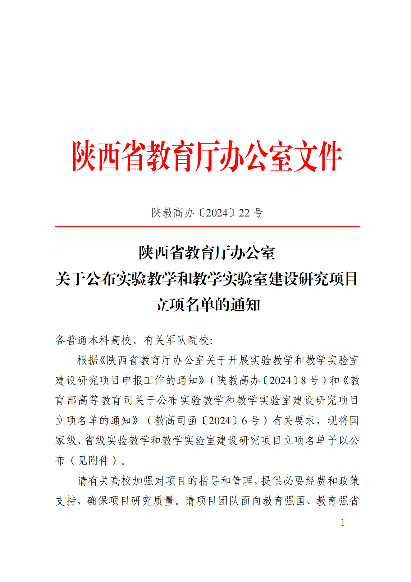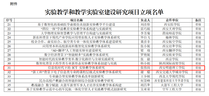 7月3日,陕西省教育厅发布了《关于公布实验教学和教学实验室建设研究项目立项名单的通知》(陕教高办〔2024〕22号),由世界杯官网信息工程学院张伟岗牵头申报的《信息化时代下的ICT实验教学体系研究》项目成功获批省级立项,这是世界杯官网在实践教学方面取得的又一标志性成果。