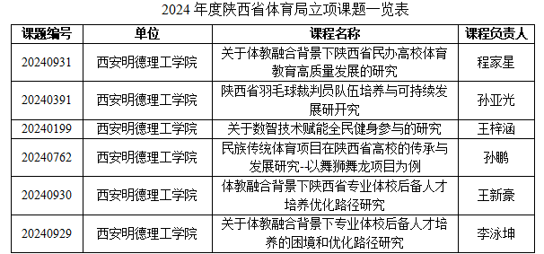 根据陕西省体育局官网发布的2024年度常规课题立项通知,通识教育学院程家星、孙亚光、孙鹏、王梓涵、王新豪、李泳坤六位教师分别申报的课题经评审获批立项。