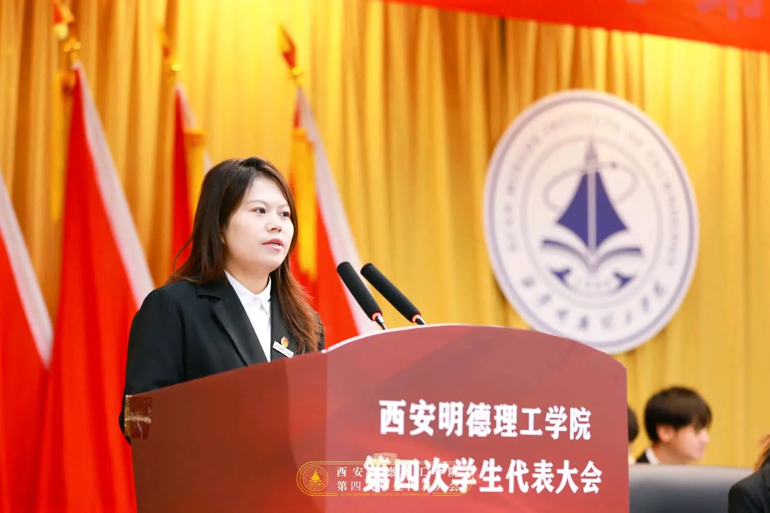 校学生会主席团成员吕梦菲同学作题为《奋楫扬帆新征程,挺膺担当正青春,为建设特色鲜明、国内一流,具有一定国际知名度的应用型大学贡献青春力量》的学生会工作报告。