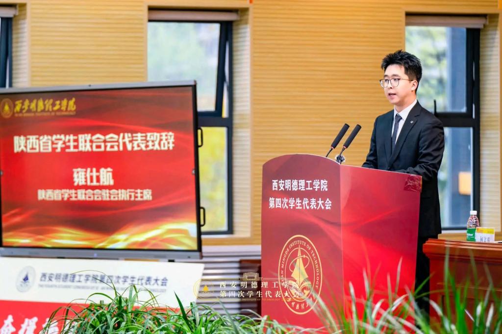 陕西省学生联合会驻会执行主席雍仕航同学致辞,对大会的召开表示热烈祝贺并希望学生会同学们强化政治认同,保持踔厉奋发姿态;坚持服务同学,始终牢记改革方向;坚持聚焦陕西定位,积极投身报国实践。为推进中国式现代化贡献属于明德学子的青春力量!