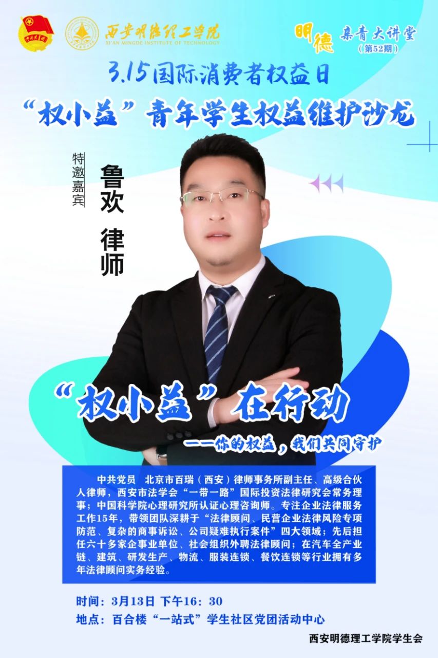 本次活动定于4月13日下午16:30,在百合楼“一站式”学生社区党团活动中心举行。我们有幸邀请到北京市百瑞(西安)律师事务所副主任、高级合伙人鲁欢律师为同学们带来权威且实用的维权知识盛宴。