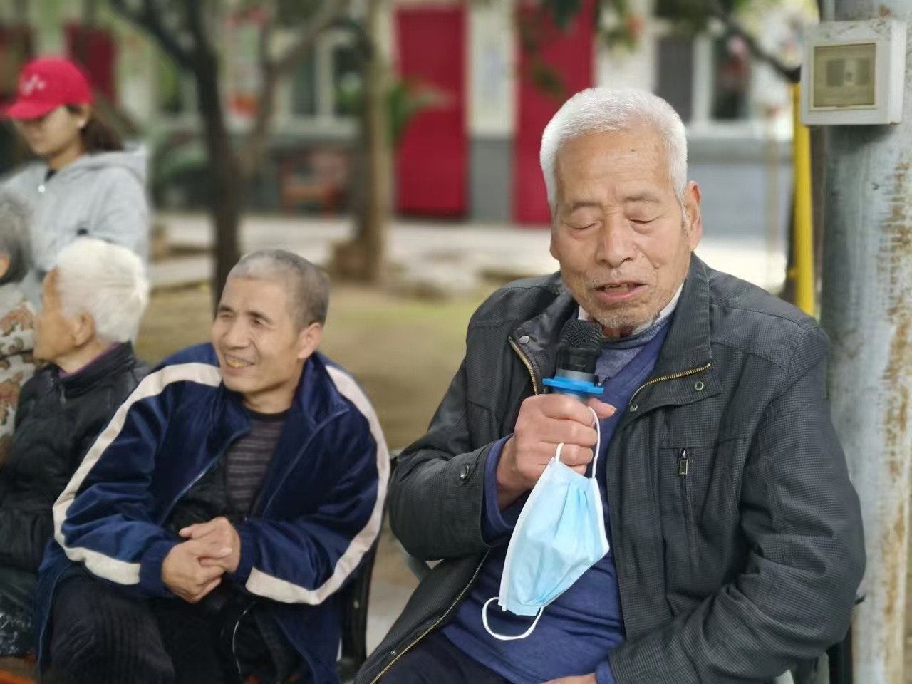 在重阳月这个特殊的日子里,敬老院里,老人们与志愿者们一同唱响了那饱含深情的爱国主义歌曲,《东方红》等经典旋律在每一个角落激昂回荡,并感染着在场的每一个人。