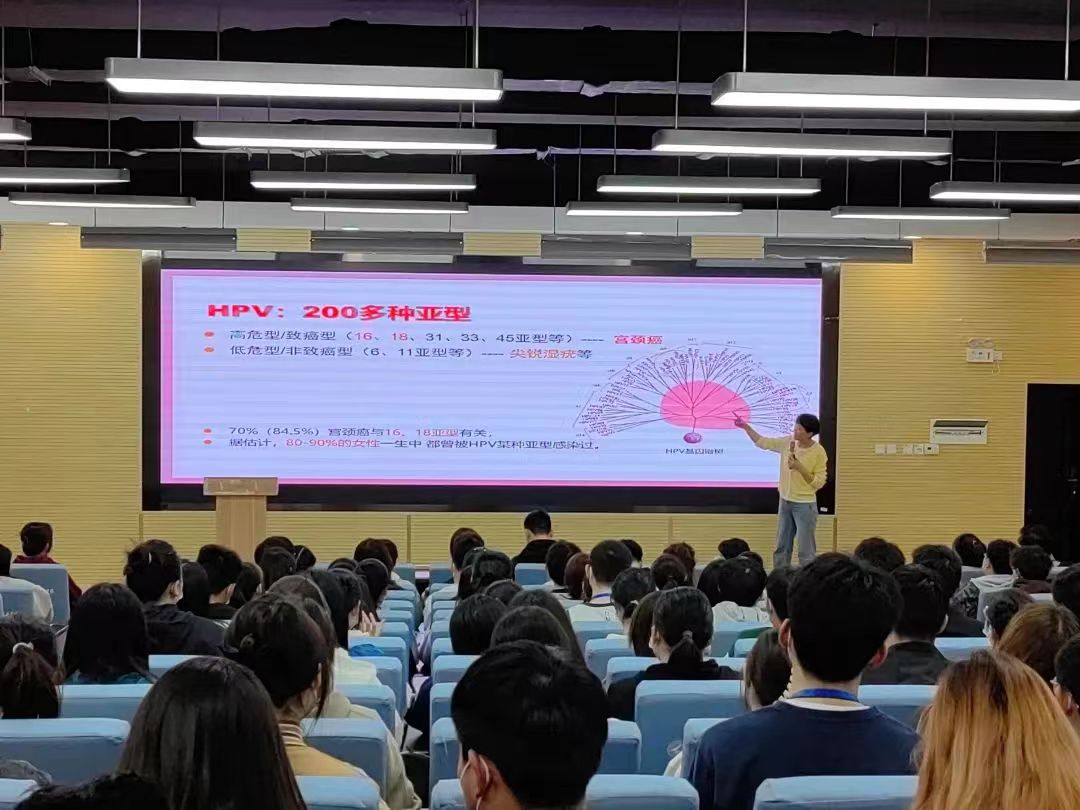 杨瑾主任引导广大学生要树立“预防胜过于治疗”的健康理念,并宣传动员学生定期进行“两癌”筛查等,做到“早诊断、早发现、早治疗”,宫颈癌是一种完全可以预防的癌症,若在早期发现,90%以上的患者可长期治愈,而HPV疫苗接种是预防HPV感染的有效方法,是消除子宫颈癌的第一道防线。