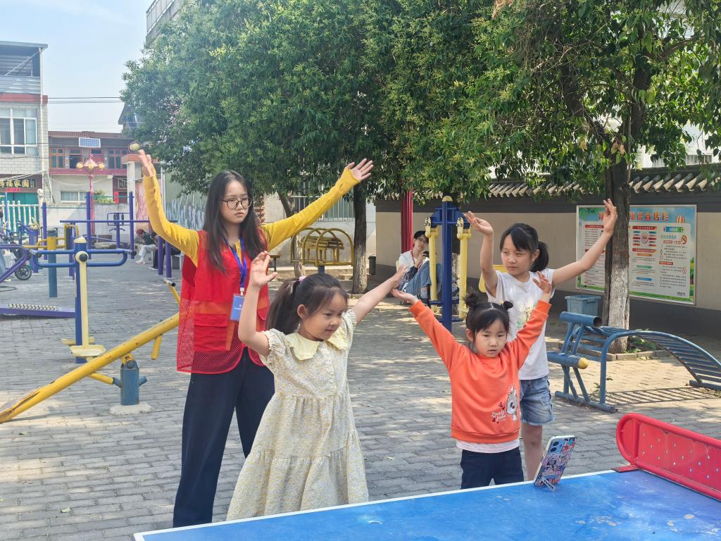除了课业辅导,志愿者带领孩子们在村委会为"爱心杯"活动排练舞蹈节目。面对零基础的孩子,志愿者们将复杂的舞蹈动作拆解成童趣满满的模仿游戏——用"小树苗生长"比喻肢体伸展,以"蝴蝶飞舞"引导手势变化。孩子们踩着欢快的节拍反复练习,从最初的动作生涩到逐渐展现出韵律感,笑声与鼓掌声在院落中此起彼伏。