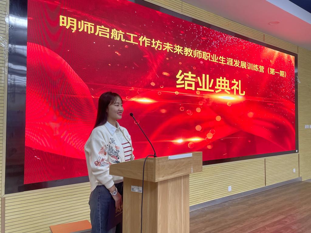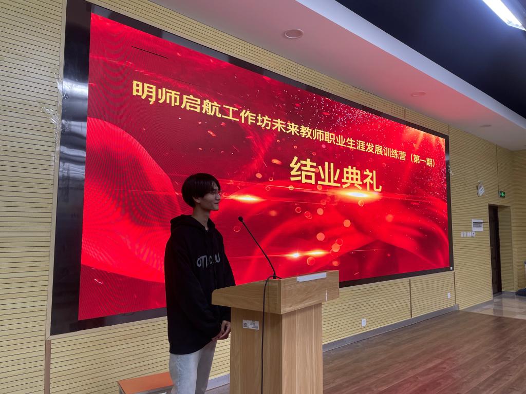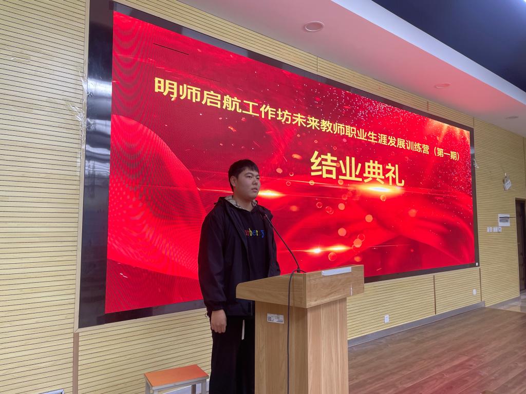 结业仪式的第一部分,训练营指导老师于立邦对本期训练营的整体成果进行了总结。于老师指出,训练营以“追寻教育梦想,共铸师者未来”为核心理念,围绕教师基本职业技能、教育理论基础、课堂管理方法等方面对学员们进行了系统培训,帮助他们进一步清晰职业规划。于老师强调,这4个月的训练不仅帮助学员们积累了实战经验,更让他们在角色转换中真正感受到了教师职业的价值与挑战,为未来职业生涯打下了坚实的基础。