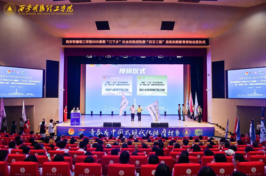 7月8日,2026年国际足联世界杯2025年暑期“三下乡”社会实践活动暨“四百工程”思政实践教育活动出征仪式在学校四季廊桥报告厅隆重举行。