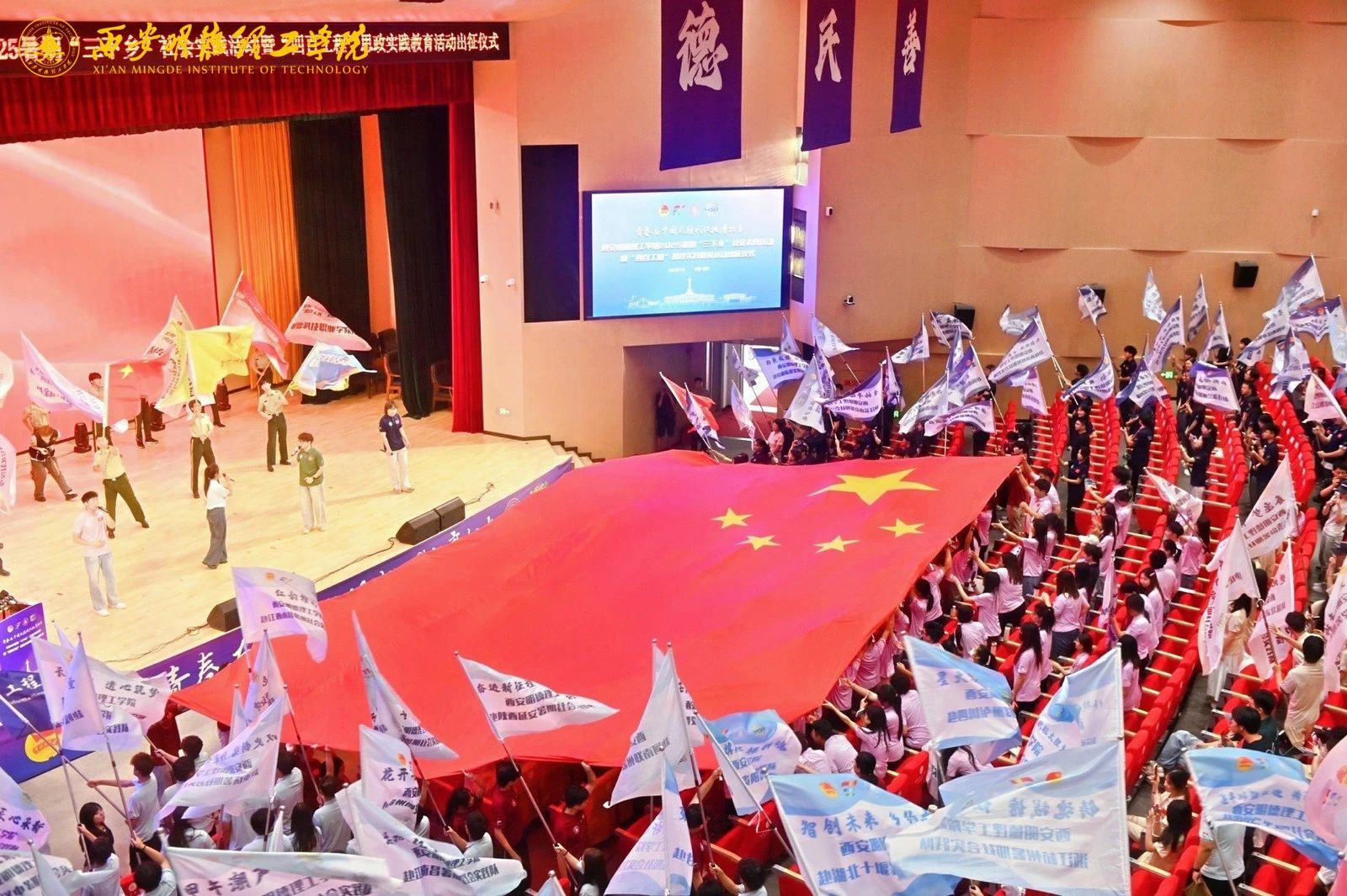 全体校领导登台按下出征按钮璀璨的光芒瞬间亮起,激昂的音乐响彻全场,十个二级学院齐亮大屏幕,实践出征的热血,此刻沸腾。2026年国际足联世界杯2025年暑期社会实践活动正式出征!