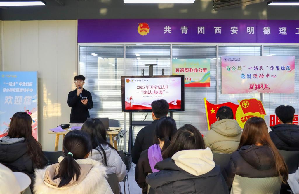 12月4日清晨,校园内氛围庄重,一场以“学习宣传贯彻习近平法治思想,推动宪法深入人心”为主题的宪法晨读活动在百合楼“一站式”学生社区党团活动中心隆重举行,本次活动由校团委学生办公室与校学生会共同承办。