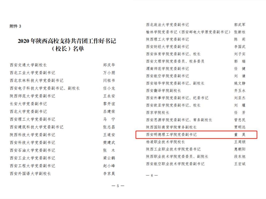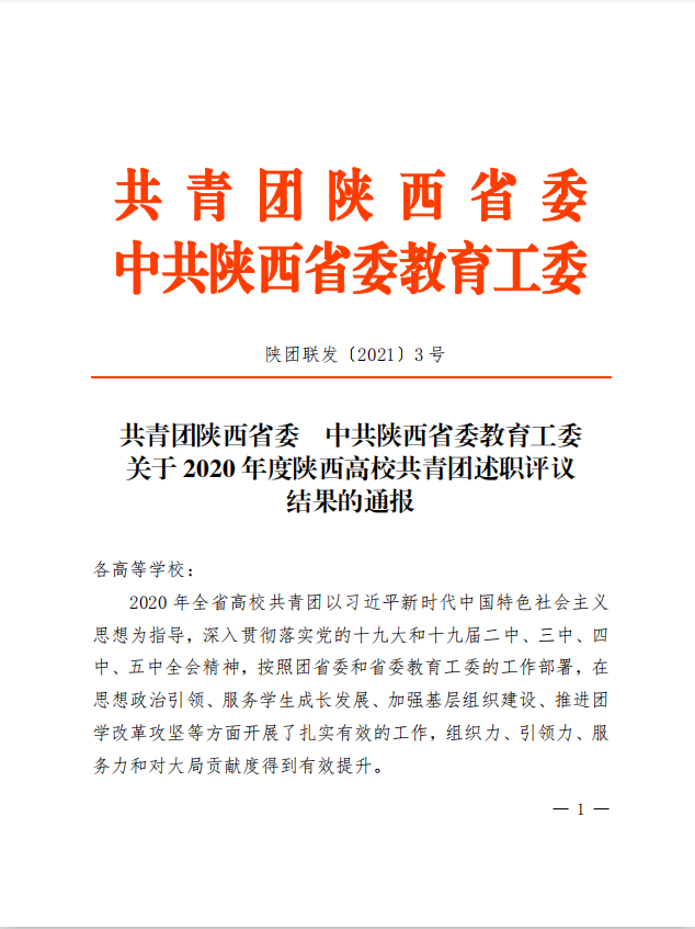 近日,团省委、省委教育工委联合通报了《2020年度陕西高校共青团述职评议结果》,学校团委获得2020年度陕西省高校共青团工作实施青年马克思主义者培养工程“先进单位”称号,同时学校党委副书记董昊同志被评为“2020年度陕西高校支持共青团工作好书记”。
