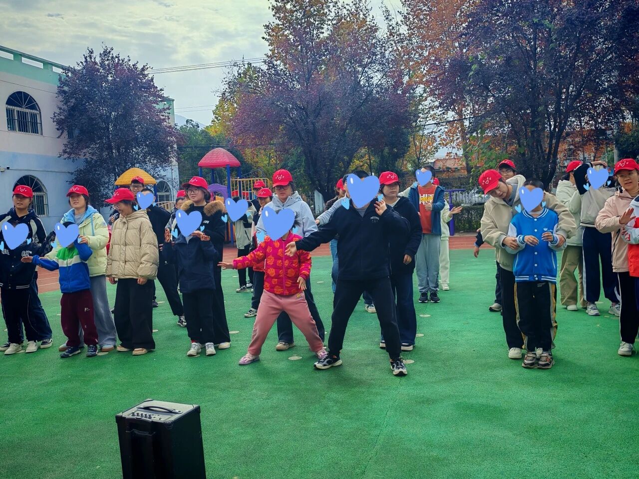 随后,欢快的音乐响起,律动舞蹈环节拉开序幕。志愿者们带领孩子们跳起简单易学的舞蹈,抬手、踏步、转身、拍手,动作充满节奏感与活力。操场上音乐与笑声交织,满是童真与欢乐。