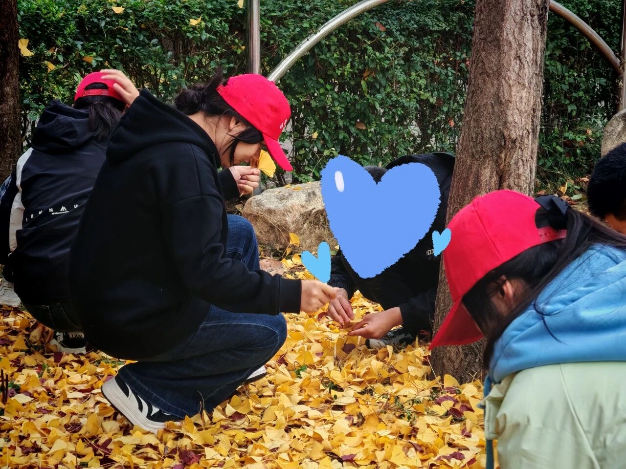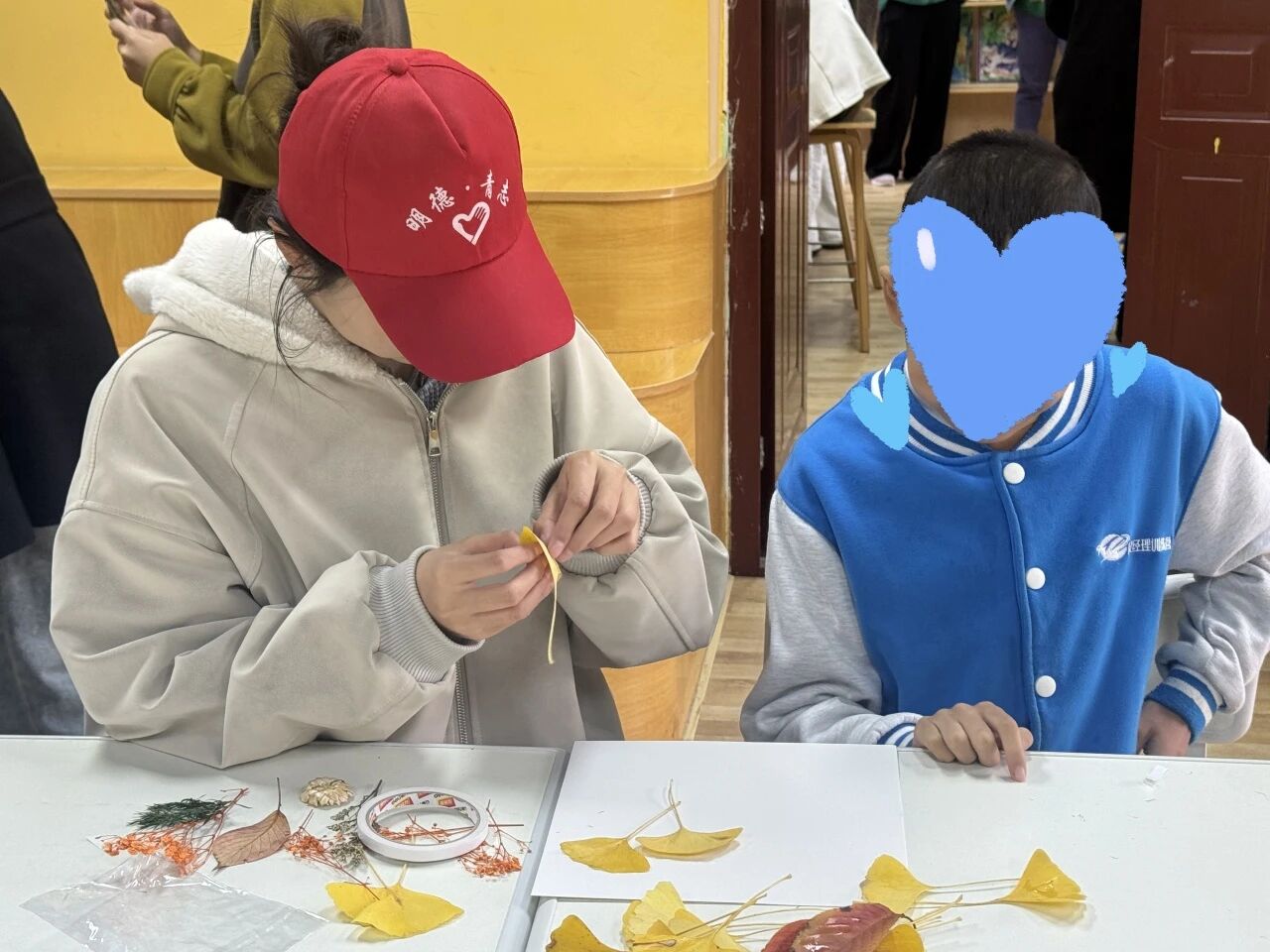 活动伊始,志愿者们带领孩子们走进户外庭院。孩子们在志愿者的陪伴下弯腰捡拾,时而举起落叶分享,时而认真挑选心仪的叶片,清脆的笑声在庭院里回荡,每一片落叶都成了大家收集的“自然素材”。