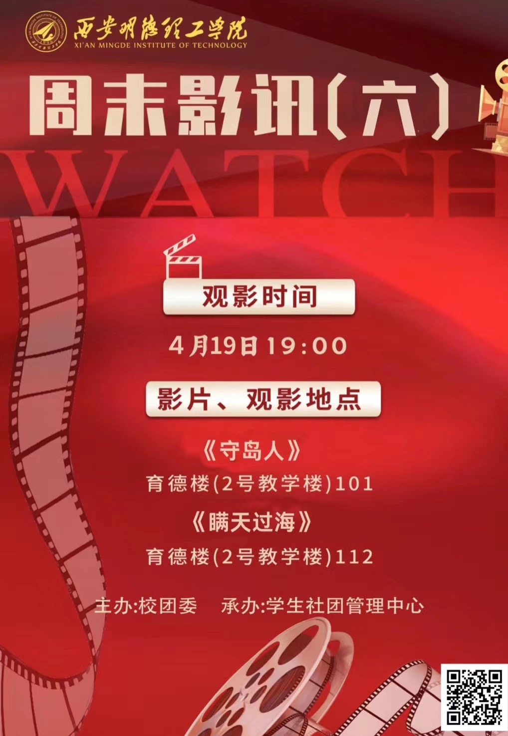 为丰富校园文化生活、缓解压力、号召明德学子学习雷锋精神,学生社团管理中心在周末进行电影《守岛人》、《瞒天过海》的展播。