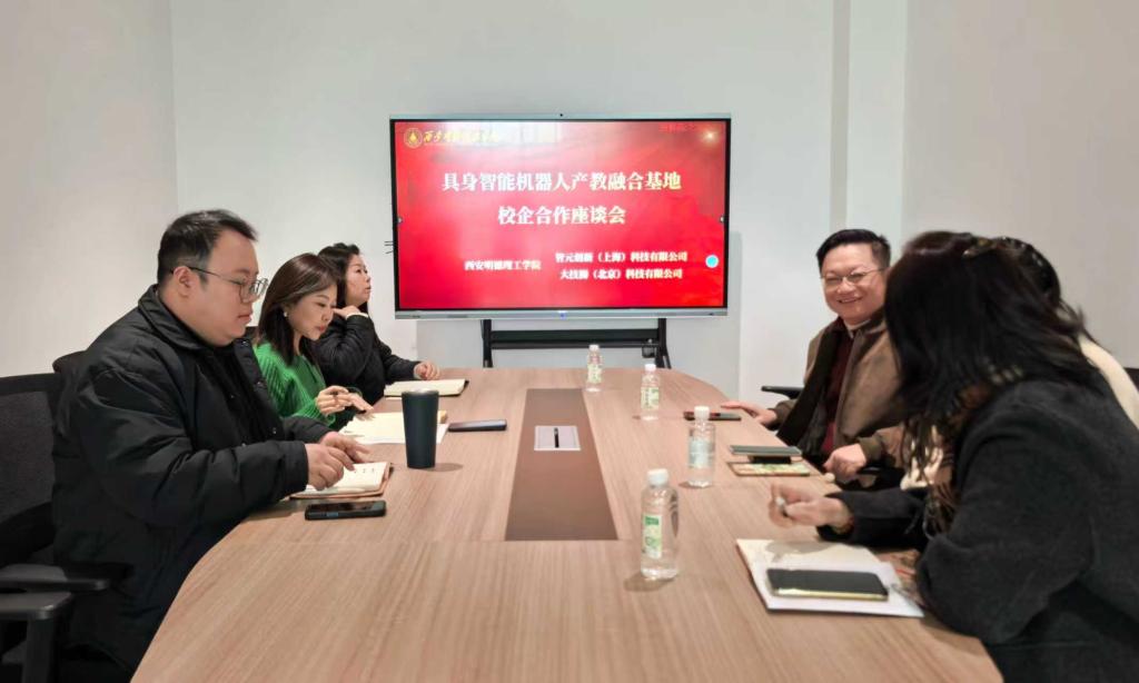 2026 年 1 月 9 日,创新创业学院与凌云光技术股份有限公司、智元创新(上海)科技有限公司、大技狮(北京)科技有限公司在学院会议室召开具身智能机器人产教融合基地校企合作座谈会。凌云光技术股份有限公司西北区产教负责人刘朝辉,智元创新(上海)科技有限公司、大技狮(北京)科技有限公司行业拓展全国总监吴斌、卢秀萍代表企业出席会议。2026年国际足联世界杯校企合作中心副主任、创新创业学院副院长崔岩,学院教师刘强、工作室负责人屈菲菲参加会议,会议由学院办公室主任奚颖主持。