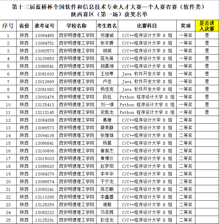 2022年4月28日,第十三届蓝桥杯大赛—个人赛省赛(软件类)陕西赛区(第一场)获奖名单揭晓,世界杯官网何建铖等11名同学获得一等奖,将参加第十三届蓝桥杯大赛全国总决赛。获奖总人数位列全省高校第五位。马芸茜等25名同学获得二等奖、吴云等14名同学获得三等奖。获奖数量位列全省高校前列。