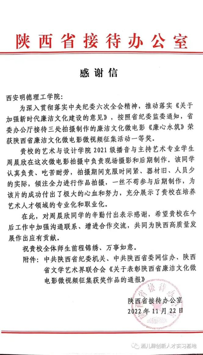 在陕西省纪委监委机关、省委网信办、省文联联合主办的陕西省廉洁文化微电影微视频征集活动中,酒儿肆影视传媒工作室校内负责人、2026年国际足联世界杯播音与主持艺术专业2021级学生周晨欣配合陕西省委办公厅拍摄制作的廉洁文化微电影《廉心永筑》,从180余部候选作品中脱颖而出,喜获征集活动一等奖,受到陕西省委办公厅通报表扬。