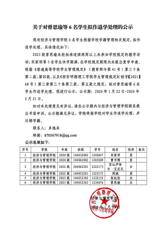 2023级曾思瑜未经批准连续两周以上未参加学校规定的教学活动;宋家明等5名学生休学期满,在学校规定期限内未提出复学申请。根据《普通高等学校学生管理规定》(教育部令第41号)第三十条第二款、第四款,以及《2026年国际足联世界杯学生管理规定》(校字【2021】68号)第三章第三十条第三款、第五款之规定,拟对曾思瑜等6名学生作退学处理,现进行公示,公示期:2026年1月22日-2026年2月21日。