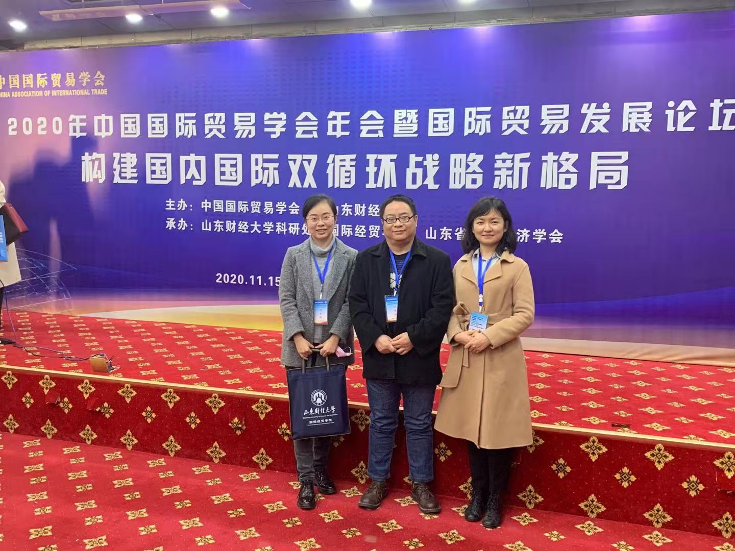 2020年11月15日至16日,由中国国际贸易学会和山东财经大学联合举办,山东财经大学科研处、山东财经大学国际经贸学院和山东省对外经济学会承办的2020年中国国际贸易学会年会暨国际贸易发展论坛在山东济南成功举办。本届年会主题为“构建国内国际双循环战略新格局”,世界杯官网经济与管理学院王乐副院长、王维新老师、解蕾老师参加了本次年会。