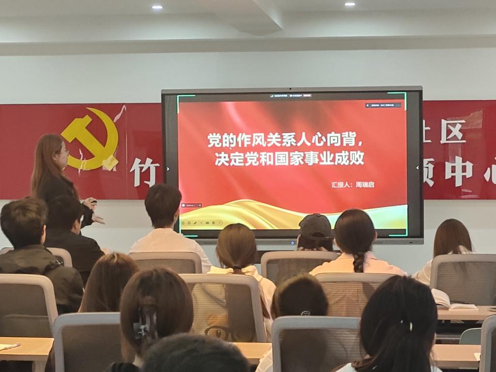 交流环节,支部党员周瑞启、张丹、阎泓锦3人作了分享。周瑞启围绕“党的作风问题关系人心向背,决定党和国家事业成败”的主题进行分享,她谈到,党的作风是党的形象,基层党组织加强党的作风建设至关重要。张丹从党员如何加强作风建设展开分享,作风建设这门“必修课”融入党员教育日常、抓在经常,永葆党的先进性。阎泓锦从学生党员如何在学院“学在明德”学风建设中发挥示范引领作用进行分享,她谈到,作为学生党员,带头践行学校“勤学善思、知行合一”的学风,努力营造良好学习氛围,继续擦亮学风建设品牌,在学校本科教学工作合格评估中贡献青春力量。与会同学纷纷表示,在今后的学习和生活中,将以更高的标准、更严的要求约束自己,努力将学习成果转化为实际行动,以良好的作风展现新时代大学生党员风采。