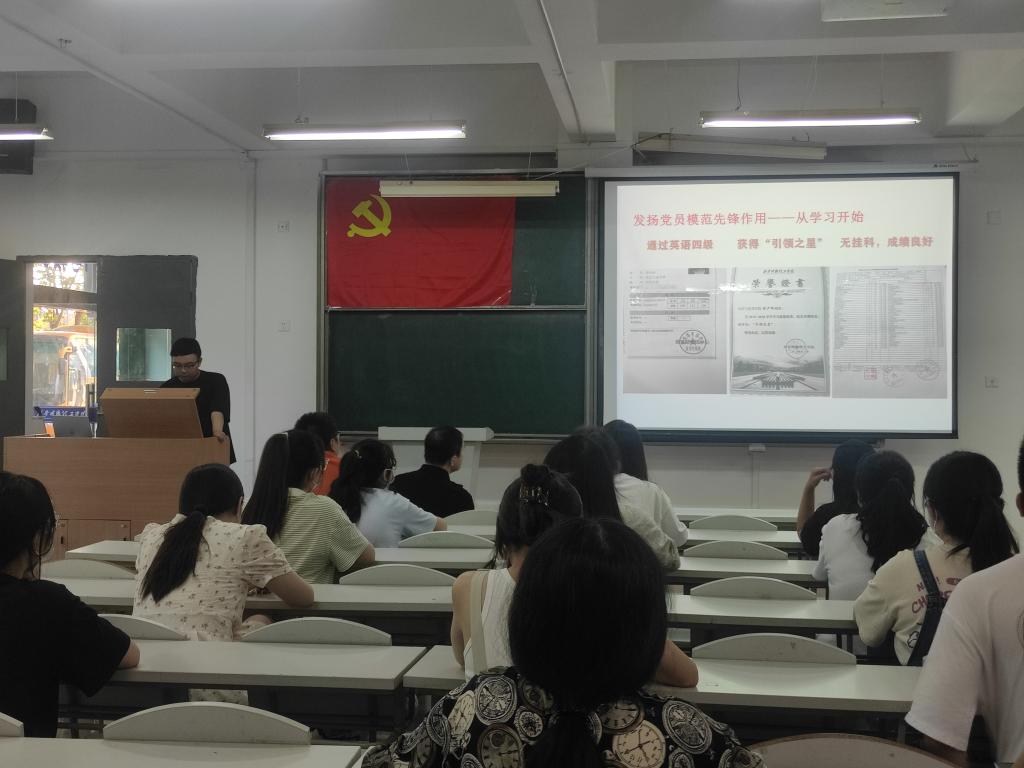 会议伊始,罗夫惠老师从党员组织关系转接流程、转接方式及注意事项等三个方面向全体毕业生党员解读了2022届毕业生党员组织关系转接相关事宜。紧接着,毕业生党员代表薛少轩和李恒2人依次从思想觉悟提升、党员先锋作用发挥、大学收获与感想等方面分享了在党组织培养下个人的成长故事,他们的精彩分享赢得现场师生的阵阵掌声。冯纪潮老师从文明离校和离校前工作安排两个方面为同学们做了毕业教育,并通报近期毕业生相关工作安排。何文举老师从共产党员为什么要坚定理想信念、共产党员怎样做到坚定理想信念、青年党员如何践行初心使命等三个方面为毕业生党员们讲了主题为“坚定理想信念,践行初心使命”的党课。最后,罗夫惠带领在场的全体党员重温入党誓词。