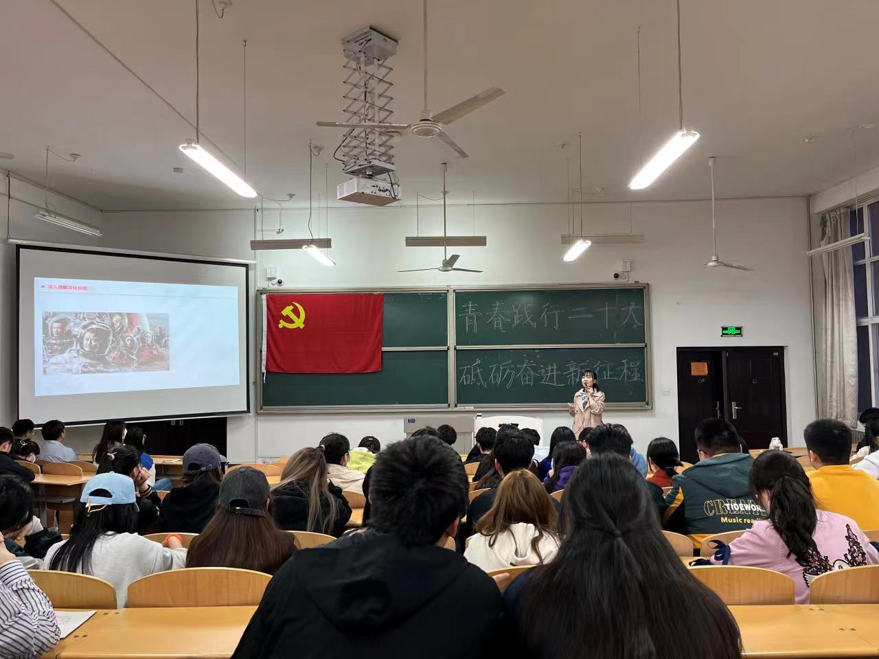 课上,胡梦妮以“坚定文化自信,践行青年学生使命担当”为题,从深入理解文化自信和青年学生的使命担当两个方面讲述了大学生坚定文化自信的意义,如何增强中华文明传播力影响力。期间她带领同学们集中学习了党的二十大报告推进文化自信自强,铸就社会主义文化新辉煌的内容,勉励同学们传承中华优秀传统文化,争做中华优秀传统文化的传播者,增强实现中华民族伟大复兴的精神力量。课堂上,师生互动频繁,气氛热烈,让现场的同学们收获颇丰。